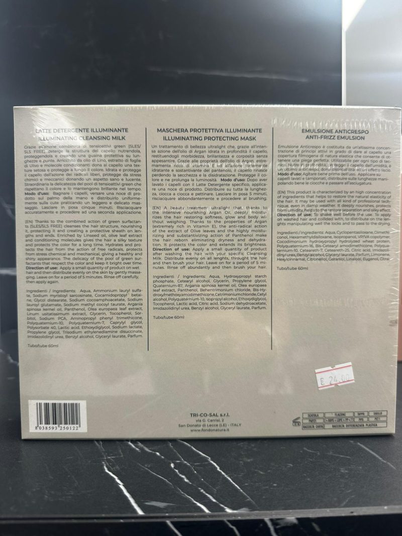 Latte Detergente Illuminante specifico per capelli trattati. Grazie all’azione combinata di tensioattivi di derivazione vegetale (SLES free) ricchi in aminoacidi e peptidi deterge la struttura del capello nutrendola, proteggendola e creando un film protettivo su lunghezze e punte. Arricchito da olio di Lino, estratto di foglie di Ulivo e molecole condizionanti dona al capello una texture setosa e protegge a lungo il colore grazie anche ad un’azione anti-radicalica. Gli straordinari principi attivi dell’ulivo sono infatti concentrati soprattutto nelle foglie. Ottimo antiossidante, ripara e nutre in profondità il capello grazie alle sue capacità emollienti. L’olio di lino è importante perché ricco di acido linoleico e alpalinoleico che incrementano l’idratazione del capello preservandone elasticità e resistenza. TUBO DA 60 ML
